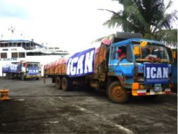 そこで当団体は、災害発生翌日より物資の調達を開始し、5日後よりレイテ島東海岸被災地において食料や水などの物資の提供を開始しました。物資は、マニラやセブ島から搬入すると大渋滞に巻き込まれ提供が遅れることが見込まれたため、ミンダナオ島のスリガオ市で調達し、レイテ島南部から毎日20トントラック2、3台で被災地に運び込みました。当初は各地で略奪が相次ぎ危険な状況であったため、軍のエスコートのもと安全管理に配慮して活動を開始し、提供の公平性を確保するために、前日までに各村(バランガイ)の役員に村内全世帯のリストを共有してもらいました。全体で9,811世帯分の食料セット(米、水、塩、砂糖、油、缶詰、マッチ、ライター、蚊取線香、石鹸などのうち、ニーズに合わせて都度内容を変更)を提供し、物資が届かず困窮していた人々の空腹を満たすことができました。