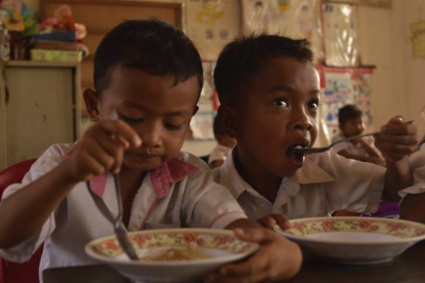 ます。給食を提供することで、子どもたちの栄養状態改善、出席率の向上、より勉強に集中できるという効