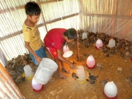 農業職員の指導のもと、400羽(オス200羽、メス200羽)の養鶏が始まりました。まだまだ小さいですが、あと3ヶ月もすれば、こども達が給食で食べられる大きさまで成長します。それから2~3ヶ