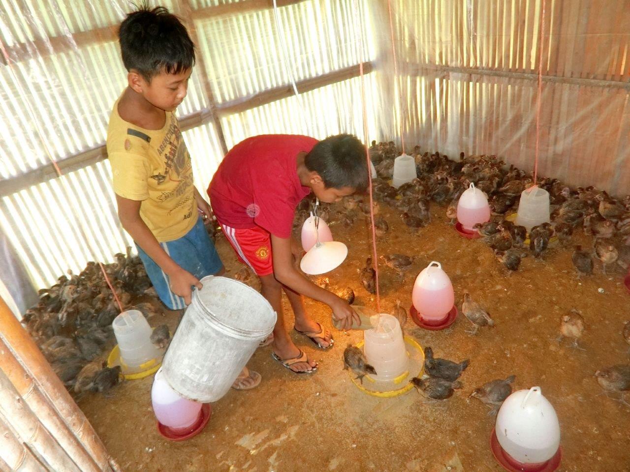 養鶏場は池の上に設置されました。鶏糞が下に落ちることで、池の魚の餌にも利用できます!雛を温めるために必要な電気や給水設備も整備しました。