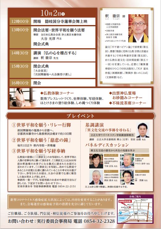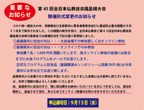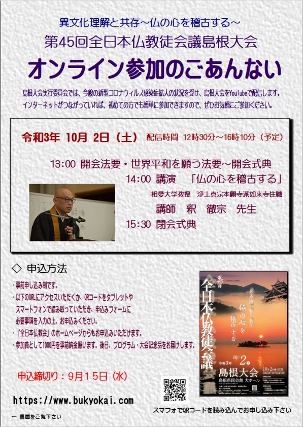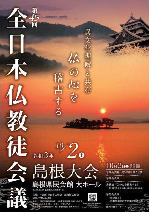その他 2021.09.06 「第45回 全日本仏教徒会議 島根大会」開催のお知らせ 10/2(土)、全日本仏教会並びに島根県仏教会主催にて、「第45回 全日本仏教徒会議 島根大会」が開催されますので、お知らせ致します。 令和3年9月6日 公益財団法人全日本仏教会 前のページへもどる