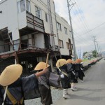 津波による被災地域で、被災家屋の解体が完了したところ、またまだ手つかずの家屋とが点在する大船渡を行脚し、いまだ復興の進まぬ状況を目の当たりにしました。今後、この同じ場所に新しく建物ができ、人々の活気が戻ることを念じつつ唱題行脚の歩を進めました。