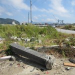 地震被害を物語る大きな修繕痕のある久円寺さまから、旧北上川沿いに海岸へ向けての行程中、路上や周辺地には津波で運ばれた砂が運搬処理されることなく堆積していました。震災から1年以上経っていても門脇小学校の焼け焦げた跡は今も生々しい目に映ります。残暑の厳しい中、一面草野原となってしまったこの地にて慰霊と復興を祈願いたしました。