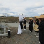 東日本大震災を風化させないための活動として、慰霊、復興祈願、唱題行脚及び募金活動を行いました。今回は岩沼市の被災した日蓮宗安圀寺さまを起点とし、日蓮宗観音教会跡地までの約7km(約3時間)の行程を唱題行脚いたしました。