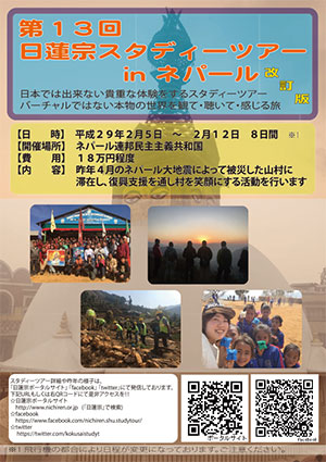 今回で13回目を迎える日蓮宗スタディーツアー、本年度は昨年に引き続き大地震にて甚大なる被害を受けたネパール、その山村に滞在して復興支援活動を行います。
