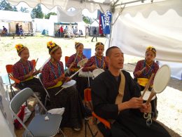 日蓮宗スカウト連絡協議会(野坂法行会長=千葉県妙厳寺住職)では、担当の教導職が常不経菩薩品の24字をスカウトと共に読み、団扇太鼓を叩きお題目を唱える「行」を勤め、「いのちに合掌」をテーマに分かりやすい言葉で教えを説いた。