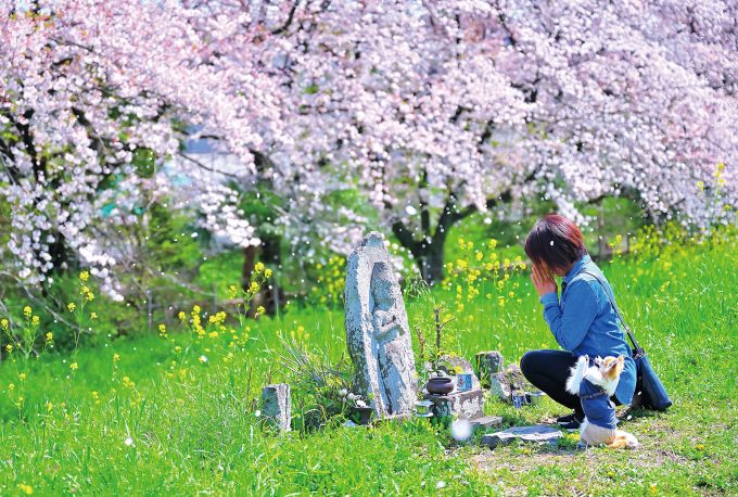 桜吹雪に菜の花という、これ以上ないほど穏やかな春の光景。そこに多くの人びとを護ってきたであろう石彫りの観音さまが鎮座しています。お姿を拝見するに、こんなのどかな日ばかりではなく、長年風雨に耐えてきたはず。新旧でありがたみが変わるものではないと思いますが、こういうお姿には自然と手を合わせたくなるものです。それは人間だけではなく、愛犬も同じだったようで……。奇跡的な一瞬を見事に、しかも心地よい距離感で捉えています。