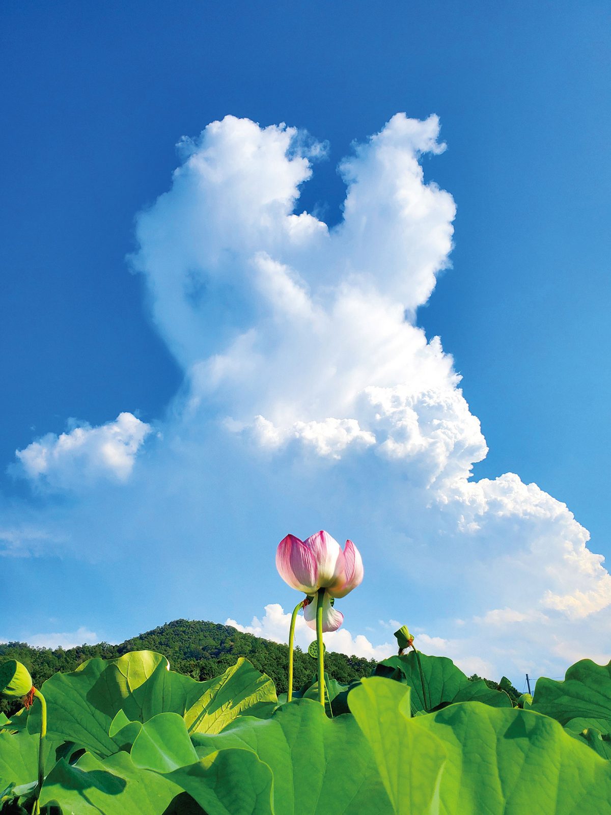 毎回このコンテストには蓮の写真がたくさん送られてきます。美しい写真も多いのですが、一方で「命」や「合掌」を連想させるものがなかなかありません。この写真は雲がまるで生きているかのように、そして手と手を合わせようとしているふうにも見えます。そして天に向かっていくように咲く一輪の蓮にも、強い生命力が感じられます。そんな様子をうまく切り取っていますが、言葉遊びのようなタイトルも素敵です。