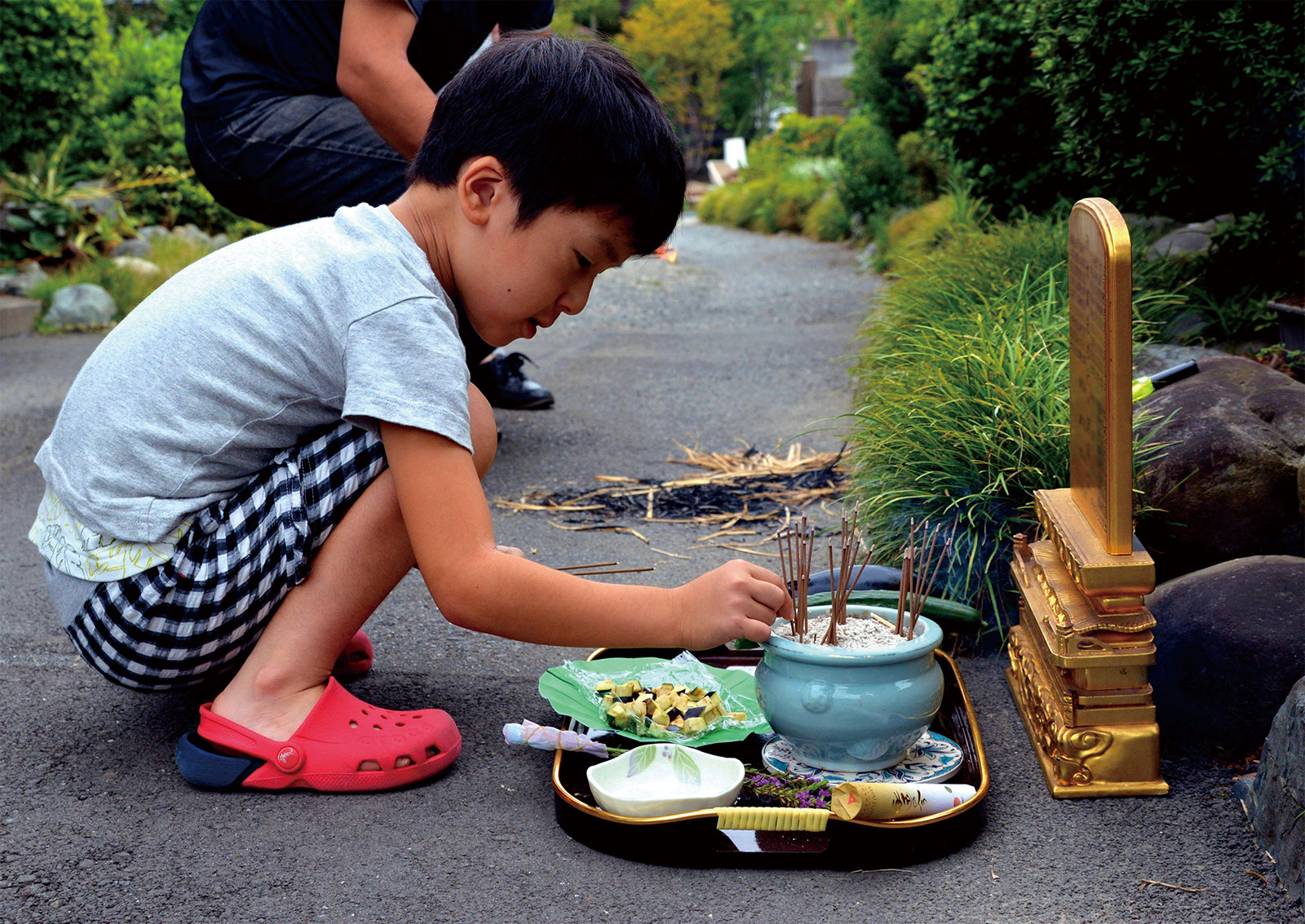 足元の明るいうちにご先祖様をお迎えしようと…。皆の感謝の思いを込めてお焼香をする。