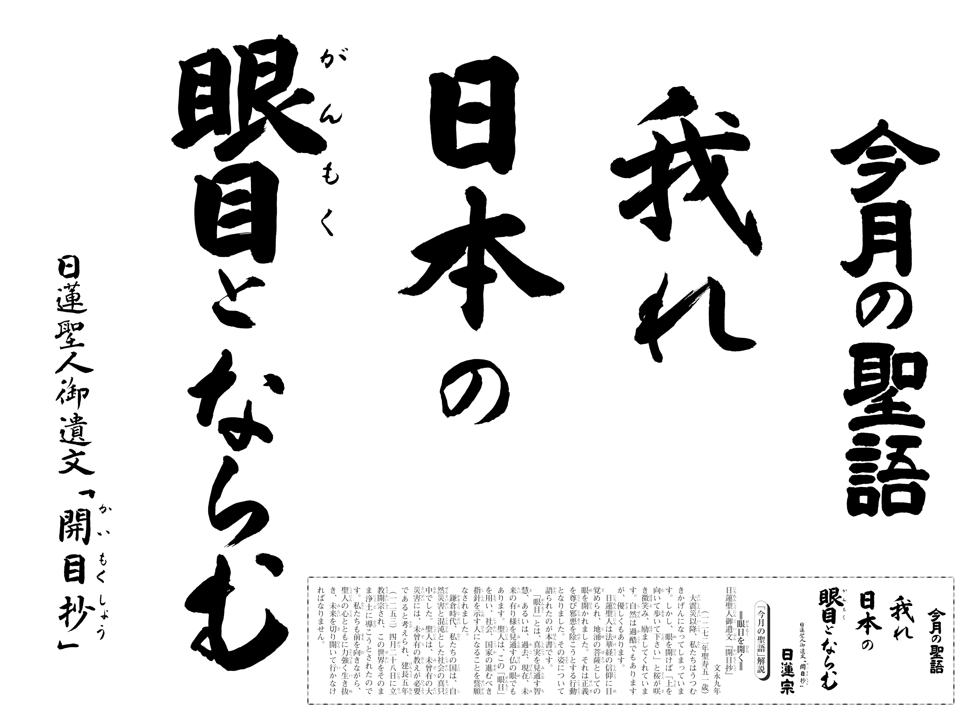 「眼目」とは、真実を見通す智慧、あるいは、過去、現在、未来の有り様を見通す仏の眼でもあります。聖人は、この「眼目」を用い、社会、国家の進むべき指針を示す人になることを誓願なされました。