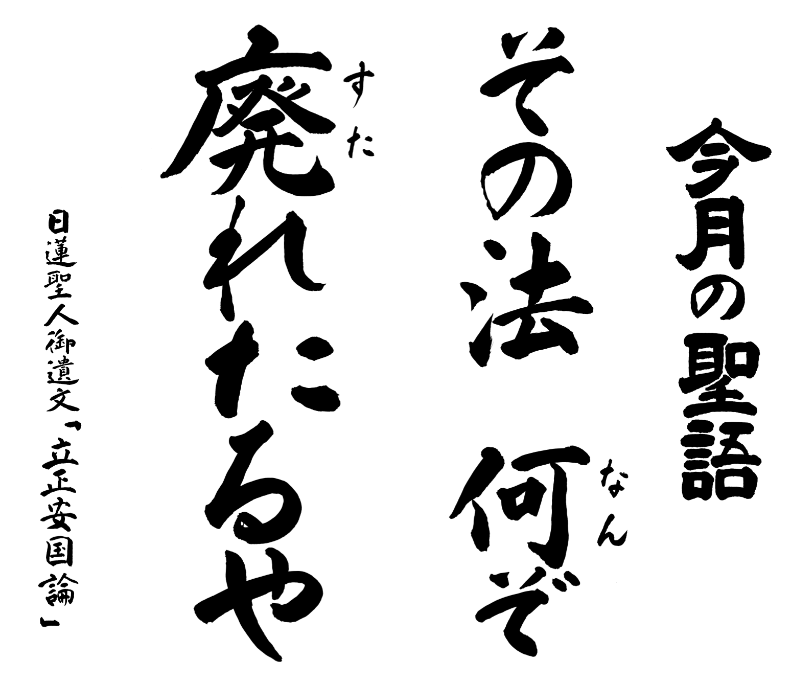 そんなとき聖人は、社会全体が幸せにならない限り、個々の幸福はないと考えられ、その方策をこの書に示され、幕府へ申し上げられたのです。